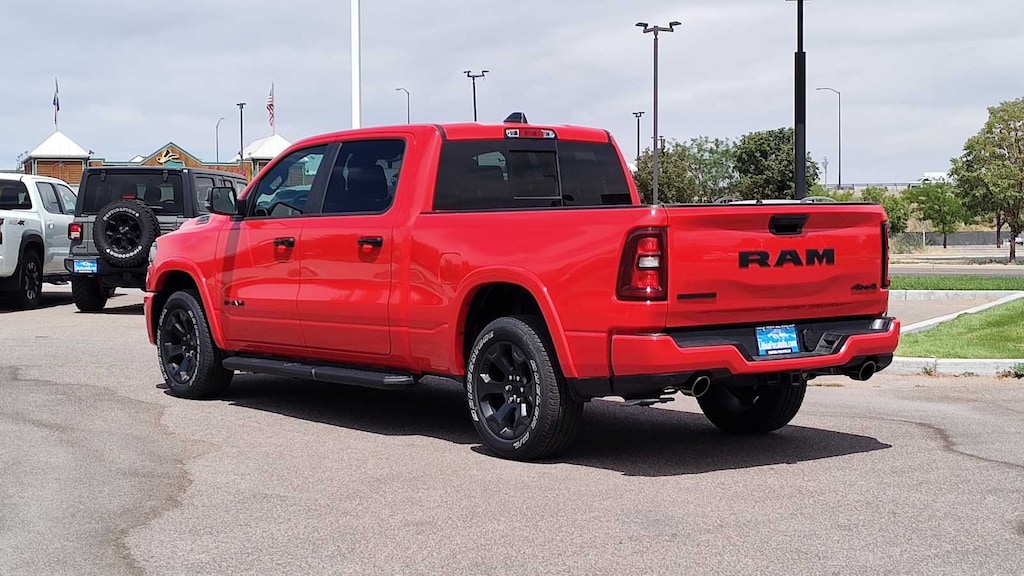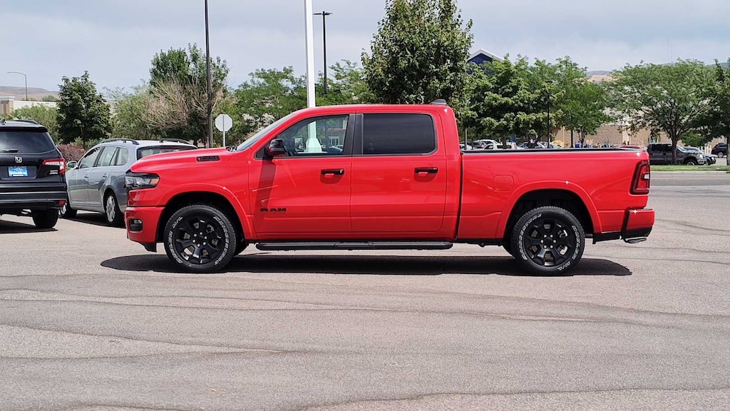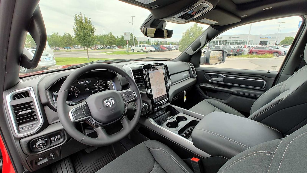 BIG HORN LEVEL 2 EQUIPMENT GROUP Google Android Auto®, Power Adjustable Pedals, Leather Wrapped Steering Wheel, 12 Touchscreen Display, Glove Box Lamp, Auto Power-Folding Mirrors, 115V Auxiliary Rear Power Outlet, Media Hub w/2 Charge Only USBs, Heated Front Seats, Security Alarm, Black Premium Power Mirrors, Apple CarPlay®, Premium Overhead Console, 9 Amplified Speakers w/Subwoofer, Remote Tailgate Release, 115V Auxiliary Power Outlet, LED Dome Lamp w/On/Off Switch, Universal Garage Door Opener, 2nd Row In Floor Storage Bins, Sun Visors w/Illuminated Vanity Mirrors, LED Footwell Lighting, Power 2-Way Driver Lumbar Adjust, Rear Window Defroster, Rear View Auto Dim Mirror, Rear Power Sliding Window, GPS Navigation, Overhead LED Lamps, Auto Dim Exterior Driver Mirror, SiriusXM w/360L, NIGHT EDITION Tires: 275/55R20 OWL All Season, Accent Color Premium Power Mirrors, Exterior Mirrors w/Supplemental Signals, Black Headlamp Bezels, Exterior Mirrors Courtesy Lamps, Grille Black Surround Black Mesh, Auto Power-Folding Mirrors, Wheels: 20 x 9.0 Aluminum Painted Clad, Auto Dim Exterior Driver Mirror, Black Exterior Truck Badging, Anti-Spin Differential Rear Axle, Accent Color Door Handles, Accent Color Tailgate Handle, Black Interior Accents, Dual Exhaust w/Black Tips, Body Color Front Bumper, Body Color Rear Bumper w/Step Pads, Black Tail Lamp Bezels, RAM Grille Badge - Black, Black Painted Exterior Mirrors Caps, DUAL-PANE PANORAMIC SUNROOF Dome Dual LED Reading Lamp, BED UTILITY GROUP MOPAR Spray In Bedliner, MOPAR 4 Adjustable Cargo Tie-Down Hooks, Pick-Up Box Lighting, Exterior 115V AC Outlet, MOPAR BLACK TUBULAR SIDE STEPS, MOPAR FRONT & REAR RUBBER FLOOR MATS, TRANSMISSION: 8-SPEED AUTOMATIC (8HP75) (STD), ENGINE: 3.0L I6 HURRICANE SO TWIN TURBO ESS (STD), BLACK, DELUXE CLOTH BUCKET SEATS Bucket Seats, Full Length Floor Console, Power Adjust 8-Way Driver Seat, Rear Center Armrest, Power 2-Way Driver Lumbar Adjust. Ram Big Horn with Flame Red Clearcoat exterior and Black interior features a Straight 6 Cylinder Engine with 420 HP at 5200 RPM*.