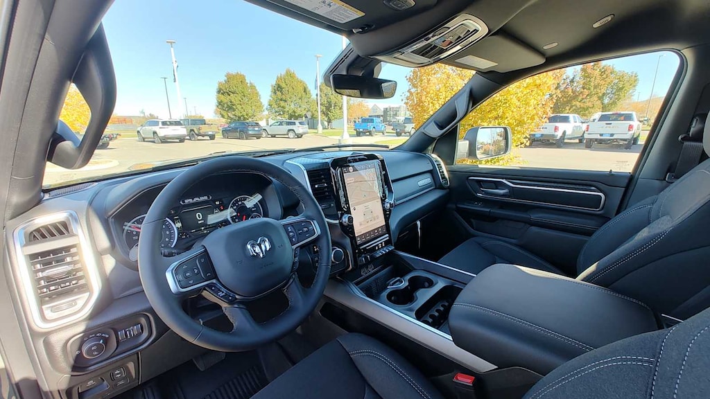 ENGINE: 5.7L V8 HEMI MDS VVT ETORQUE Active Noise Control System, Heavy Duty Engine Cooling, Passive Tuned Mass Damper, GVWR: 7,100 lbs, Dual Rear Exhaust w/Bright Tips, G/T Exhaust, 18 Aluminum Spare Wheel, 33 Gallon Fuel Tank, BIG HORN LEVEL 2 EQUIPMENT GROUP SiriusXM Radio Service, Power Adjustable Pedals, Leather Wrapped Steering Wheel, 12 Touchscreen Display, Glove Box Lamp, Auto Power-Folding Mirrors, 115V Auxiliary Rear Power Outlet, Media Hub w/2 Charge Only USBs, Heated Front Seats, Security Alarm, Black Premium Power Mirrors, Premium Overhead Console, 9 Amplified Speakers w/Subwoofer, Disassociated Touchscreen Display, Secondary Active Grille Shutters, Wireless Charging Pad, Body Color Fender Flares, Remote Tailgate Release, 115V Auxiliary Power Outlet, LED Dome Lamp w/On/Off Switch, Universal Garage Door Opener, 2nd Row In Floor Storage Bins, Sun Visors w/Illuminated Vanity Mirrors, LED Footwell Lighting, Rear Window Defroster, Rear View Auto Dim Mirror, Rear Power Sliding Window, GPS Navigation, NIGHT EDITION Tires: 275/55R20 OWL All Season, Bridgestone Brand Tires, Accent Color Premium Power Mirrors, Exterior Mirrors w/Supplemental Signals, Black Headlamp Bezels, Exterior Mirrors Courtesy Lamps, Grille Black Surround Black Mesh, Auto Power-Folding Mirrors, Wheels: 20 x 9.0 Aluminum Painted Clad, Auto Dim Exterior Driver Mirror, Black Exterior Truck Badging, Anti-Spin Differential Rear Axle, Accent Color Door Handles, Accent Color Tailgate Handle, Black Interior Accents, Dual Exhaust w/Black Tips, Body Color Front Bumper, Body Color Rear Bumper w/Step Pads, Black Tail Lamp Bezels, RAM Grille Badge - Black, Black Painted Exterior Mirrors Caps, BED UTILITY GROUP MOPAR Spray In Bedliner, MOPAR 4 Adjustable Cargo Tie-Down Hooks, Pick-Up Box Lighting, Exterior 115V AC Outlet, MOPAR FRONT & REAR RUBBER FLOOR MATS, TRANSMISSION: 8-SPEED AUTOMATIC (8HP75). Ram Big Horn with Canyon Lake exterior and Black interior features a 8 Cylinder Engine with 305 HP at 6400 RPM*. Approx. Original Base Sticker Price: $63,500*.