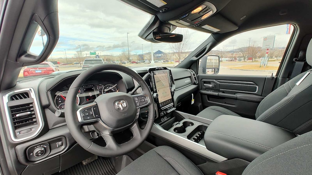 ENGINE: 6.7L I6 CUMMINS HO TURBO DIESEL Selective Catalytic Reduction (Urea), Dual 730 Amp Maintenance Free Batteries, Cummins Turbo Diesel Badge, Heavy Duty Engine Cooling, Diesel Exhaust Brake, Supplemental Heater, 3.42 Axle Ratio, Front Bumper Sight Shields, Capless Fuel Fill w/o Discriminator, GVWR: 11,040 lbs, BIG HORN LEVEL 1 PLUS EQUIPMENT GROUP Emergency Vehicle Alert System (EVAS), 12 Touchscreen Display, Glove Box Lamp, Auto Power-Folding Mirrors, Footwell Courtesy Lamp, Anti-Spin Differential Rear Axle, MOPAR Deployable Bed Step, Alexa Built-In, Forward & Reverse Utility Lights, Locking Lower Glove Box, Remote Start System, 9 Alpine Speakers w/Subwoofer, Disassociated Touchscreen Display, Dual Glove Boxes, 2nd Row In Floor Storage Bins, Rear View Auto Dim Mirror, Rear Dome w/On/Off Switch Lamp, LED Bed Lighting, GPS Navigation, SiriusXM w/360L, Connected Travel & Traffic Services, Foam Bottle Insert (Door Trim Panel), Big Horn IP Badge, Off-Road Info Pages, Trailer Tow Pages, HD Radio, Radio: Uconnect 5 Nav w/12.0 Display, Power Heated Folding Telescopic Mirrors, Steering Wheel Mounted, NIGHT EDITION Gloss Black Nostrils/Mic Black Grille, Tires: LT285/60R20E OWL On/Off Road, Black Exterior Truck Badging, Wheels: 20 x 8.0 Black Painted Aluminum, Body Color Grille-Surround, Black Interior Accents, Black Wheel Center Hub, Painted Front Bumper, Painted Rear Bumper, BLACK, PREMIUM CLOTH BUCKET SEATS Bucket Seats, Power Adjust 8-Way Driver Seat, Folding Flat Load Floor Storage, Rear 60/40 Folding Seat, Front Seat Back Map Pockets, Power 2-Way Driver Lumbar Adjust, Full Length Upgraded Floor Console, MOPAR FRONT & REAR RUBBER FLOOR MATS, TRANSMISSION: 8-SPEED TORQUEFLITE HD AUTOMATIC, HEATED SEATS & WHEEL GROUP Heated Steering Wheel, Heated Front Seats. Ram Big Horn with Ceramic Gray Clearcoat exterior and Black interior features a Straight 6 Cylinder Engine with 430 HP at 2800 RPM*. Approx. Original Base Sticker Price: $79,700*.