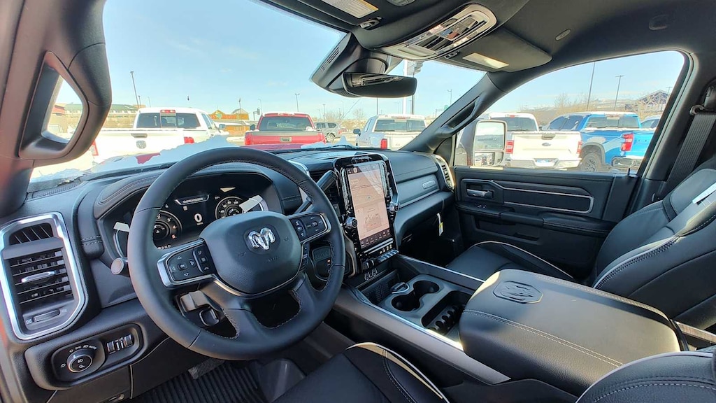 ENGINE: 6.7L I6 CUMMINS HO TURBO DIESEL Selective Catalytic Reduction (Urea), Dual 730 Amp Maintenance Free Batteries, Cummins Turbo Diesel Badge, Heavy Duty Engine Cooling, Diesel Exhaust Brake, Supplemental Heater, 3.42 Axle Ratio, Front Bumper Sight Shields, Capless Fuel Fill w/o Discriminator, GVWR: 11,040 lbs, NIGHT EDITION Tires: LT285/60R20E OWL On/Off Road, Black Exterior Truck Badging, Wheels: 20 x 8.0 Black Painted Aluminum, Gloss Black Grille Billets/Accents, Body Color Grille-Surround, Sport Performance Hood, Black Exterior Mirrors, LARAMIE LEVEL 1 PLUS EQUIPMENT GROUP CTR Stop Lamp w/Cargo View Camera, Rain Sensitive Windshield Wipers, Power Adjustable Pedals w/Memory, LED Bed Lighting, Traffic Sign Recognition, Adaptive Steering System, Auto Dim Exterior Mirror, Anti-Spin Differential Rear Axle, Drowsy Driver Detection, MOPAR Deployable Bed Step, Foam Bottle Insert (Door Trim Panel), Active Lane Management System, Power Heated Fold Telescopic Mirrors w/Memory, MOPAR Spray In Bedliner, Remote Tailgate Release, Auto High Beam Headlamp Control, Exterior Mirrors w/Memory, 2nd Row In Floor Storage Bins, Auto Dim Exterior Passenger Mirror, Auto Adjust In Reverse Exterior Mirrors, MOPAR FRONT & REAR RUBBER FLOOR MATS, TRANSMISSION: 8-SPEED TORQUEFLITE HD AUTOMATIC, BLACK, LEATHER TRIMMED BUCKET SEATS Bucket Seats, Dual Wireless Charging Pad, Ventilated Front Seats, Radio/Driver Seat/Mirrors/Pedals Memory, Full Length Upgraded Floor Console. Ram Laramie with Flame Red Clearcoat exterior and Black interior features a Straight 6 Cylinder Engine with 430 HP at 2800 RPM*. Approx. Original Base Sticker Price: $86,500*.