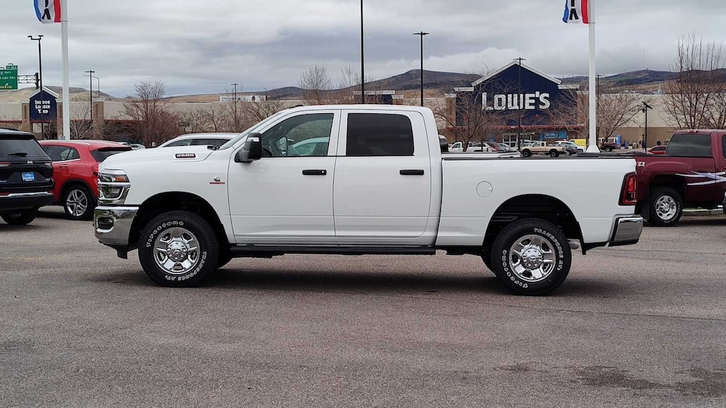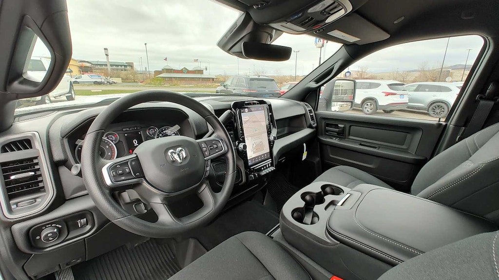 ENGINE: 6.7L I6 CUMMINS HO TURBO DIESEL Selective Catalytic Reduction (Urea), Dual 730 Amp Maintenance Free Batteries, Cummins Turbo Diesel Badge, Heavy Duty Engine Cooling, Diesel Exhaust Brake, Supplemental Heater, 3.42 Axle Ratio, Front Bumper Sight Shields, Capless Fuel Fill w/o Discriminator, GVWR: 11,040 lbs, TRADESMAN LEVEL 2 EQUIPMENT GROUP Convenience Group, Emergency Vehicle Alert System (EVAS), 12 Touchscreen Display, Anti-Spin Differential Rear Axle, Mirror Running Lights, Exterior 115V AC Outlet, Alexa Built-In, Power-Adjustable Convex Aux Mirrors, Disassociated Touchscreen Display, Matte Black Mesh Grille w/Chrome, 115V Auxiliary Front Power Outlet, Center Hub, Tires: LT275/70R18E BSW AS, Rear View Auto Dim Mirror, Rear Power Sliding Window, Tinted Acoustic Windshield Glass, GPS Navigation, Bright Rear Bumper, Exterior Mirrors w/Heating Element, Chrome Grille Surround, MOPAR Black Tubular Side Steps, SiriusXM w/360L, Connected Travel & Traffic Services, Wheels: 18 x 8.0 Steel Chrome Clad, Carpet Floor Covering, Off-Road Info Pages, Trailer Tow Pages, 400W Inverter, HD Radio, Power, BED CONVENIENCE GROUP MOPAR Spray In Bedliner, LED Bed Lighting, TRANSMISSION: 8-SPEED TORQUEFLITE HD AUTOMATIC, BLACK, CLOTH 40/20/40 BENCH SEAT. Ram Tradesman with Bright White Clearcoat exterior and Black interior features a Straight 6 Cylinder Engine with 430 HP at 2800 RPM*. Approx. Original Base Sticker Price: $73,700*.