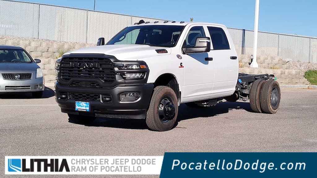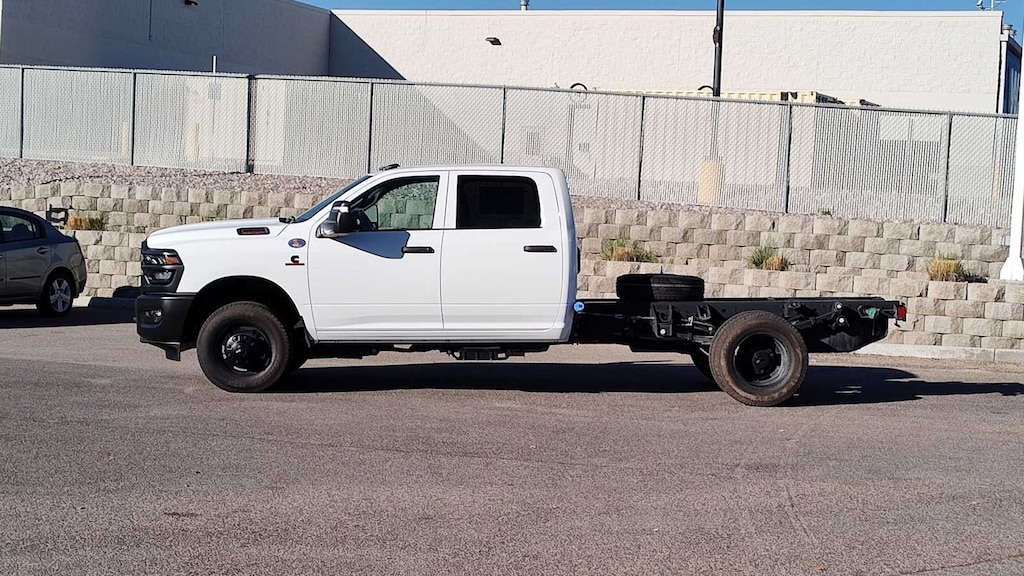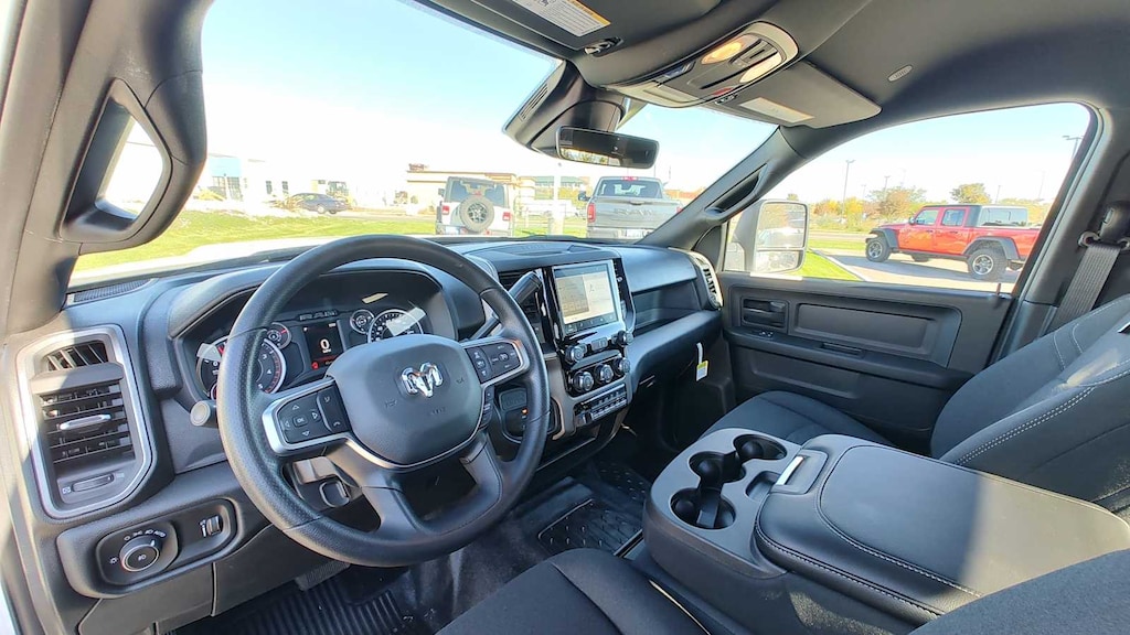 ENGINE: 6.7L I6 CUMMINS TURBO DIESEL Selective Catalytic Reduction (Urea), Dual 730 Amp Maintenance Free Batteries, Clean Idle Emissions Label, Cummins Turbo Diesel Badge, Current Generation Engine Controller, Smart Diesel Exhaust Brake, Supplemental Heater, 3.42 Axle Ratio, B-20 Bio Diesel Capability, DUAL REAR WHEELS Tires: LT235/80R17E BSW All-Season, Center Hub, 6000# Front Axle w/Hub Ext, Wheels: 17 x 6.0 Black Painted Steel, Nexen Brand Tires, 11.50 Dual Wheels Rear Axle, TRANSMISSION: 8-SPEED TORQUEFLITE HD AUTOMATIC (DFM) Transfer Case Skid Plate Shield, Power Take-Off Right/Left, TRADESMAN LEVEL 1 EQUIPMENT GROUP Rear Window Defroster, Black Power Heated Fold Telescope Mirrors, Exterior Mirrors w/Supplemental Signals, Exterior Mirrors Courtesy Lamps, Exterior Mirrors w/Heating Element, Trailer Brake Control, Trailer Light Check, Mirror Running Lights, Power Adjust Mirrors, Power-Adjustable Convex Aux Mirrors, PARKSENSE FRONT/REAR PARK ASSIST SYSTEM, BLACK, CLOTH 40/20/40 BENCH SEAT 4 Way Front Headrests. Ram Tradesman with Bright White Clearcoat exterior and Black interior features a Straight 6 Cylinder Engine with 360 HP at 2800 RPM*. Approx. Original Base Sticker Price: $71,500*.