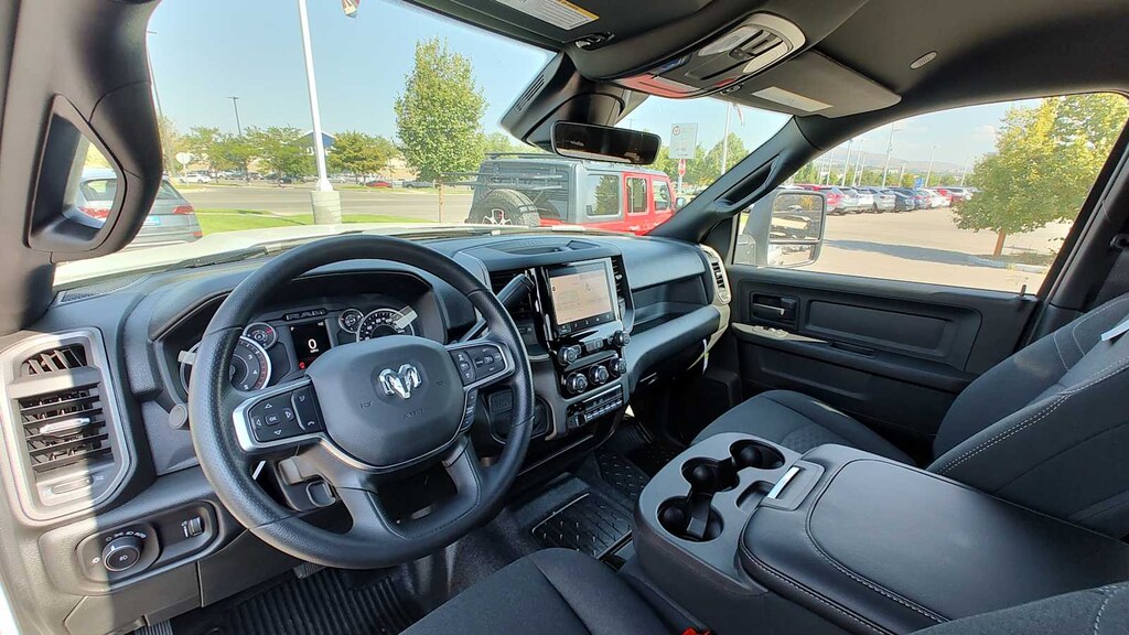 ENGINE: 6.7L I6 CUMMINS TURBO DIESEL Selective Catalytic Reduction (Urea), Dual 730 Amp Maintenance Free Batteries, Clean Idle Emissions Label, Cummins Turbo Diesel Badge, Current Generation Engine Controller, Smart Diesel Exhaust Brake, Supplemental Heater, B-20 Bio Diesel Capability, GVWR: 19,500 lbs, TRANSMISSION: 8-SPEED TORQUEFLITE HD AUTOMATIC (DFM), TRADESMAN LEVEL 1 EQUIPMENT GROUP Rear Window Defroster, Black Power Heated Fold Telescope Mirrors, Exterior Mirrors w/Supplemental Signals, Exterior Mirrors Courtesy Lamps, Exterior Mirrors w/Heating Element, Trailer Brake Control, Trailer Light Check, Mirror Running Lights, Power Adjust Mirrors, Power-Adjustable Convex Aux Mirrors, PARKVIEW REAR BACK-UP CAMERA, BLACK, CLOTH 40/20/40 BENCH SEAT Storage Tray, 2 Way Rear Headrest Seat, 4 Way Front Headrests. Ram Tradesman with Bright White Clearcoat exterior and Black interior features a Straight 6 Cylinder Engine with 360 HP at 2800 RPM*. Approx. Original Base Sticker Price: $79,700*.